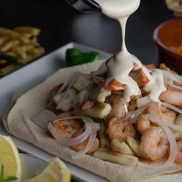 Seafood Fajita: A sizzling mix of fresh seafood, peppers, and onions, served with warm tortillas for a flavorful and zesty meal.
